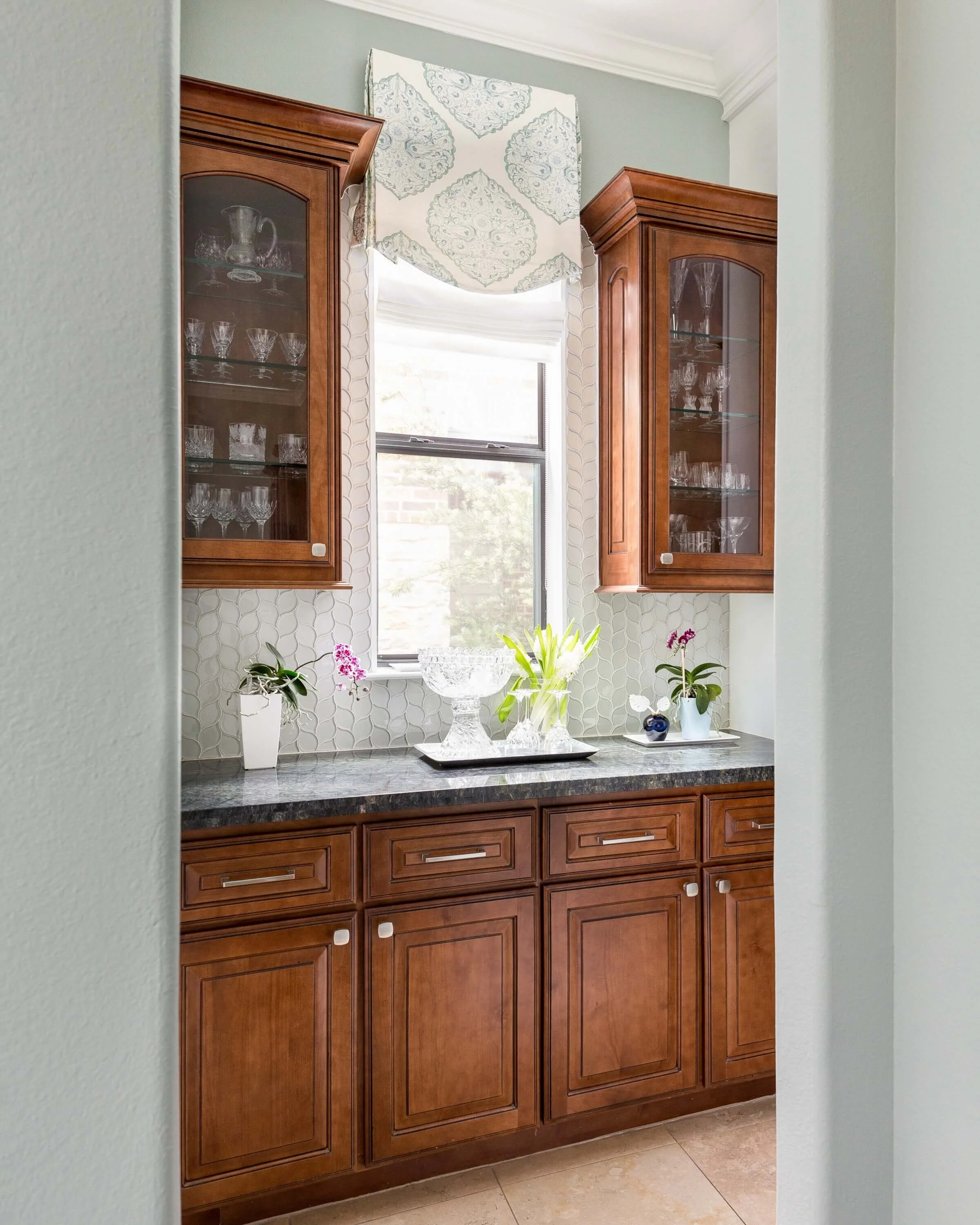 Kitchen counter with geometric backsplash.